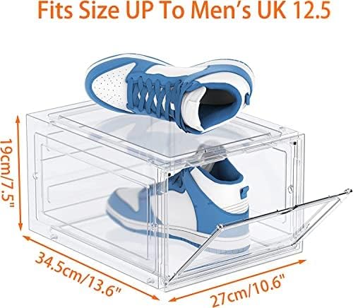 The overall assembly size of the shoe box is 34.5 x 27 x 19 cm, with an inner size that fits shoes up to UK size 12.5. Its facing design allows you to easily see which shoe boxes are in use or empty at a glance. No more struggle with messy shoe boxes: Start organizing your shoes today.